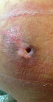 Úlceras cavitadas en los glúteos derecho e izquierdo. Aspecto inicial del derecho (A) e izquierdo (C), aspecto de la úlcera a los 70 días del derecho (b) e izquierdo (D) de aplicación de productos Quitomex tópico.