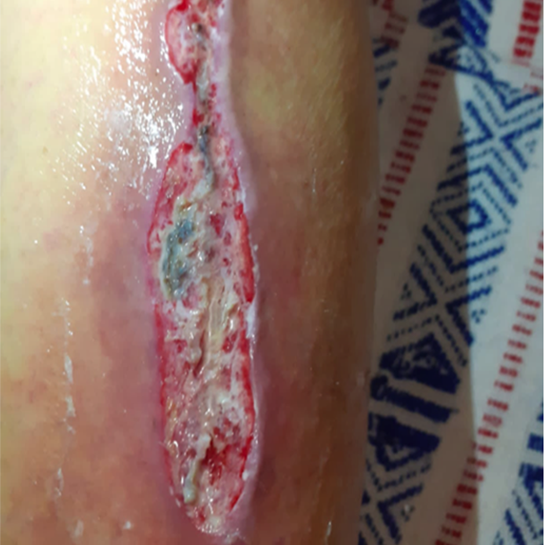 Herida en cara anterior de pierna izquierda de más de 10 cm de diámetro mayor con infección la cual mediante la aplicación de productos Quitomex tópico por 70 días se aprecia el cierre completo de la lesión sin mostrar datos de infección.
