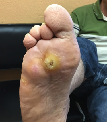Diabético con ulceración plantar de pie derecho. (A) La ulceración inicial en un grado 2 de Wagner y posterior al tratamiento (B) con productos Quitomex tópico por 8 meses se aprecia el cierre casi completo de la lesión y sin datos de infección.