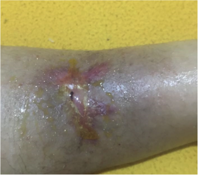Herida en cara anterior de pierna izquierda de más de 10 cm de diámetro mayor con infección la cual mediante la aplicación de productos Quitomex tópico por 70 días se aprecia el cierre completo de la lesión sin mostrar datos de infección.
