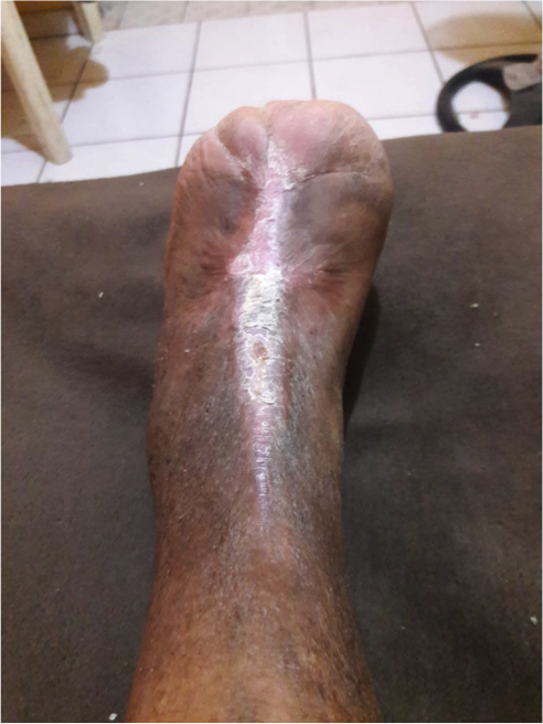Diabético con amputación complicada con pérdida de piel de cobertura de muñón en pie izquierdo manejado con productos Quitomex tópico por 90 días se aprecia la cobertura completa de muñón de amputación.